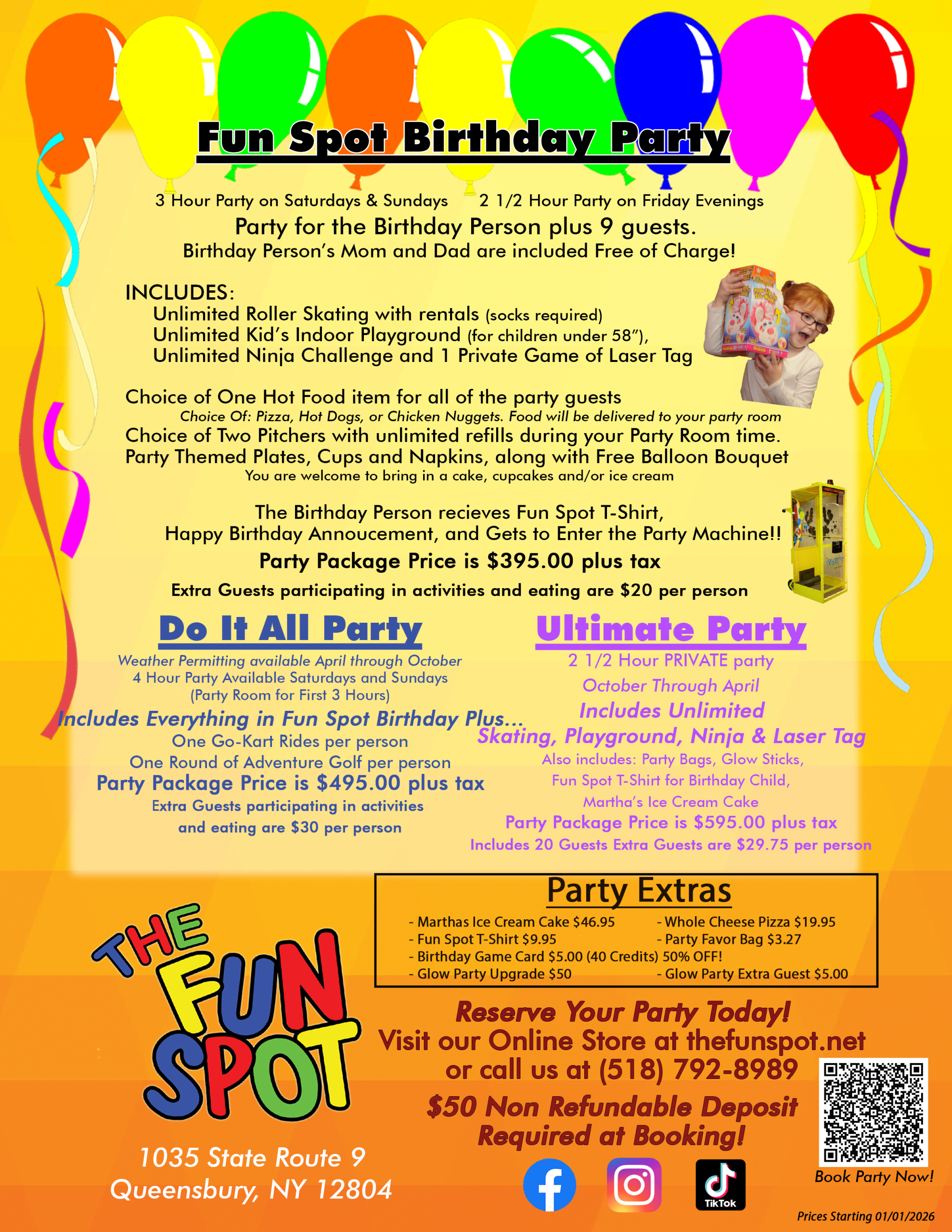CLICK ON THE LINK ABOVE TO BOOK YOUR BIRTHDAY PARTY OR CALL (518) 792-8989